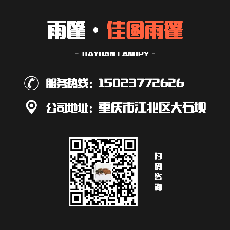 重庆佳圆雨篷有限公司是一家专门从事户外雨篷设计、研发、生产和销售的实体企业,至今已有10多年的历史,主要生产移动雨篷,大型仓库雨篷,伸缩式雨篷,大排档雨篷,推拉雨篷,推拉雨篷,曲臂雨篷,法式雨篷等,产品具有很强的防腐、防雨、防晒等效果。本公司充分吸纳当今休闲用品的前端技术和风格,为您带来质价相宜,时尚典雅的各种户外雨篷,产品主要用于工厂,商业广场,饭店,别墅,小区,旅游景点等场所。公司始终坚持“创新、品质、服务、敬业、感恩”的理念。严把质量关口,全方位的服务跟踪,坚持做出高品质产品,产品远销全球各地。公司经过多年的风风雨雨,已逐渐成为行业的领头人,拥有良好的市场知名度与雄厚的实力,追求专业化发展道路,始终掌握高端精密的核心技术,精湛的生产制造工艺和严格的产品质量控制,用我们的专业化服务帮助客户利用好每一寸土地,创造更高的价值!  |